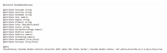 To import the datasets into Weka, it is necessary to convert them from CSV (comma-separated values) files into ARFF files, which is a format specific to Weka. The ARFF (attribute-relation file format) format is very similar to the CSV format, which is a common and versatile format used mostly to handle datasets but is more complex since it specifies the data type of each attribute. In Figure 3, we can see an example of an ARFF file. An ARFF file is composed of three segments []: