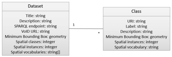 An RDF triple is a statement about two resources that follows the subject predicate object structure, where subject and object represent two resources and predicate their relation. A set of triples (S) is denoted as , where I, L, and R represent instances, literals, and relations, respectively, so that subject corresponds to an instance, predicate to a relation, and object to an instance or a literal. With the term spatial dataset, we refer to “a set of RDF triples published, maintained or aggregated provided by a single provider” [] containing spatial instances, that is, a subject explicitly georeferenced with predicates defined in a spatial vocabulary. A spatial vocabulary defines predicates that allow the representation of an instance location in the form of longitude/latitude coordinates in a well-known Coordinate Reference System (CRS), such as WGS84 (e.g., Athens hasLongitude “23.58”). A spatial class is a subset of a spatial dataset containing spatial instances declared to be instances of a dataset class using the rdf:type predicate (e.g., Athens rdf:type City). In this work, we search and catalog spatial datasets and their spatial classes, whose instances’ locations are expressed as single points, that is, by a longitude and a latitude value, using the W3C Basic Geo [], GeoVocab [], GeoSPARQL [], GeoNames [], or GeoRSS [], which are common spatial vocabularies listed in Linked Open Vocabulary (LOV) [] and LOV4IoT []. Furthermore, we search and catalog only those datasets provided by SPARQL endpoints and not by other means, such as RDF dump files. A SPARQL endpoint is an interface that is accessible through a URL and allows access to the triples of a dataset using SPARQL, which is the standard language for querying linked data. Therefore, the terms datasets and SPARQL endpoints are used in the remainder of the paper interchangeably.
