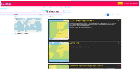 GeoLOD web interface is available at http://geolod.net/ (accessed on 16 April 2021). The frontend application was developed in React [] and the backend API in Node.js []. The queries to the SPARQL endpoints were sent with the Fetch SPARQL endpoint node.js module []. The thumbnails depicting the bounding box of datasets and classes were generated with the Static Image Mapbox API [], and the interactive maps were built on Leaflet [] and OpenLayers []. The database behind the application is the PostgreSQL with the PostGIS [] extension for spatial data management. GeoLOD is hosted in a Ubuntu 18 LTS 4GB Virtual Machine, provided by okeanos, a GRNET cloud Infrastructure as a Service (IaaS) for Greek academic institutes.