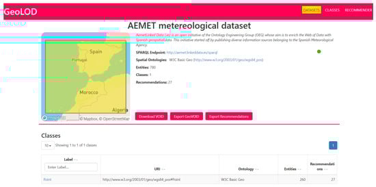 In addition to the user interface, GeoLOD provides a REST API to serve its content in well-known templates and formats, enabling software-based consumption. Specifically, it provides services that expose GeoLOD metadata and content description in the Data Catalog Vocabulary (DCAT) [] format, an RDF vocabulary designed to facilitate interoperability among data catalogs, and dataset descriptions in GeoVoID that can aid source selection in query federation systems. It also provides services that export (a) SILK and LIMES configuration files for a selected pair of classes and (b) class recommendation lists for datasets and classes in order to be consumed as input in batch link discovery processes. The main novelties of GeoLOD are: