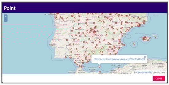 Point class instances of the AEMET dataset on map. The user can click on an instance to get more info in a pop up.