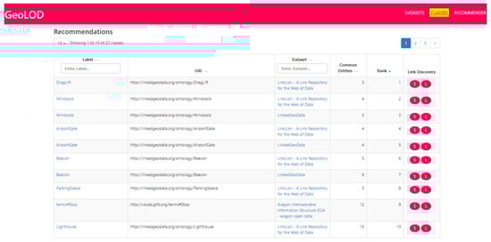 GeoLOD creates summaries and recommendations for all classes in the Catalog by executing the recommendation algorithm described above with the following modifications. Instead of determining the ranking based on one metric, it combines the three most effective metrics, which, according to the evaluation performed in [], are the Poisson Distribution Probability (PD), the Pointwise Mutual Information (PMI), and the Phi Coefficient (PHI), as follows: the pairs of classes (the source and each of the target classes) are ranked three times based on the similarity score for each metric. Then, the three ranking positions for each pair are summed to compute its combined ranking. For example, if a pair of classes is ranked 1st for the PD, 6th for the PMI, and 3rd for the PHI metric, its combined ranking is 10. Finally, the combined ranking of all pairs is sorted in ascending order to generate the final ranked list of recommended classes.