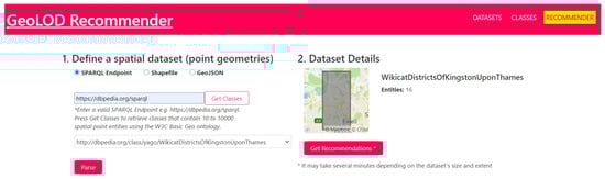 - It allows on-the-fly recommendations for user-defined SPARQL endpoints and spatial datasets in GeoJSON and Shapefile format.