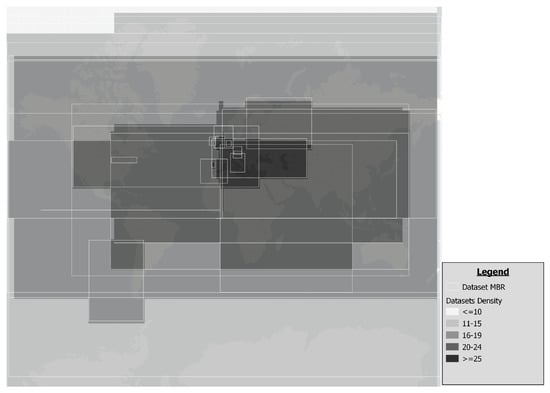 Next, we present information about the spatial characteristics of linked data datasets and classes. Table 4 presents the statistical distribution of datasets and classes by the size of their spatial extents (i.e., their mininum bounding rectangles), classified into five categories, each representing an area roughly equal to a common geographical notion, ranging from small areas, covering medium sized cities, to large areas, covering the whole world. Most datasets and classes are “global” or cover areas approximately equal to continents (about 78% of datasets and 87% of classes), which shows that most linked data providers publish large area datasets and that few providers published local datasets. Furthermore, by inspecting classes content on the GeoLOD interactive map, we noticed that in many cases, the population completeness, that is, the percentage of all real-world objects of a particular type that are represented in a class [], regarding spatial instances at local level is small. The implication of these findings is that local mapping organizations have not yet adopted linked data technologies. Figure 7 shows the spatial extents of all spatial datasets and their density all over the world and indicates that most non-global-scale datasets are located in and around Europe. A closer examination of Figure 7 reveals potential georeferencing errors for some datasets. For example, there is a dataset that extends in a small area around zero longitude and latitude in the Gulf of Guinea at the Atlantic Ocean and another whose MBR is a thin line that starts in the Pacific Ocean, east of South America, and ends in Australia.