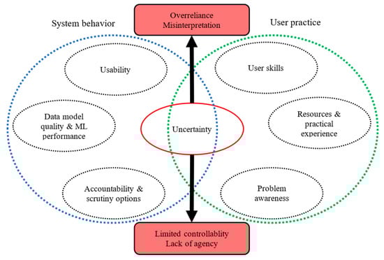 Essentially, this requires heuristic approaches that enable the gaining of the aforementioned systemic perspective. In this regard, it is crucial to understand how DAB can emerge and what main factors influence the severity of DAB-related risks. A basic component is uncertainty, which can have different but interrelated reasons. According to studies on AB, humans tend to over-rely on automated systems due to: inexperience or lack of skills or confidence, lack of options to scrutinize an automated process (input, output, or action). This can be further complicated due to little practical experience or limited resources, e.g., due to pressure to act, lack of time and high workload [27,43,44,45]. All these issues are likely to aggravate in the case of DAB. In particular, as the higher complexity and opacity of AI systems reinforces the problem of lacking options to scrutinize the functionality and automated processes of the system. This can lead to further issues, i.e., a lack of agency, e.g., because of a generally lacking problem awareness and/or a lack of options to intervene in an automated decision-making process.
