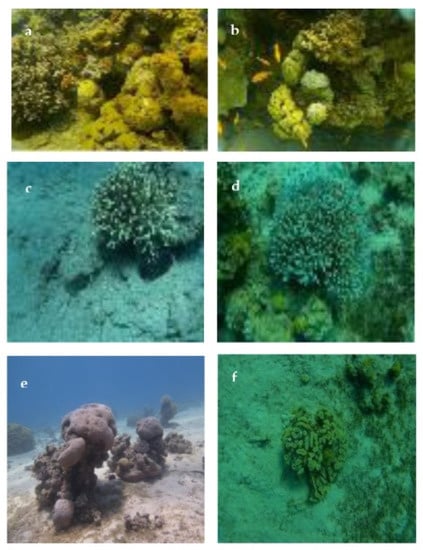 Coral reefs at the four study sites in the Gulf of Eilat. (a,b) Coral Reefs sites 2 and 3, (c,d) Coral reef at site 1, (e,f) Coral reef at site 4.