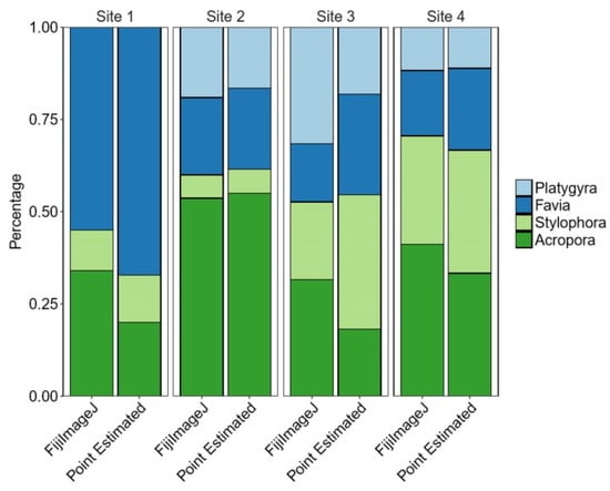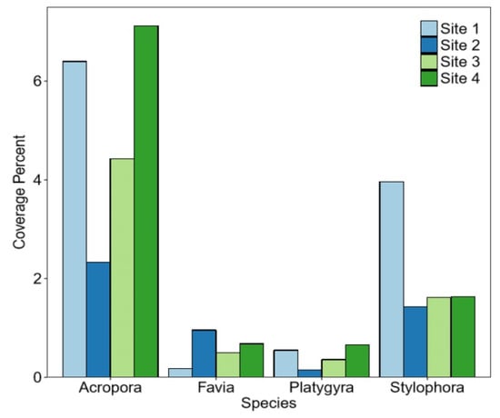The highest coverage percentage in sites 1–4 was observed for Acropora. Stylophora has the highest coverage percentage in site 1 and the lowest in site 2. Favia has the highest coverage percentage in site 2 and the lowest in site 1; Platygyra has the highest coverage percentage in site 4 and the lowest in site 2 (see Figure 6).