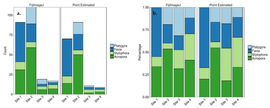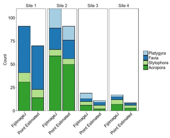 - Coral species quantities and coverage percentage of each of the common coral species at each site (sites 1–4) using each method (point estimated and Fiji ImageJ)