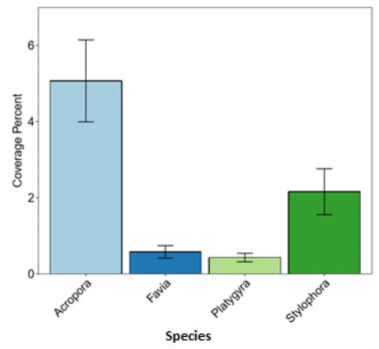 A Tukey post hoc test showed that the coverage of Acropora was significantly higher than all other species (Favia—p = 0.0013, Platygyra—p = 0.001, Stylophora—p = 0.028), but the coverage of Favia was not significantly different than Platygyra and Stylophora.