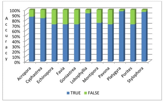 The “Test” data results show that the highest accuracy was observed for Platygyra (97.33%), followed by other coral species including Stylophora (96%), Lobophyllia (93.33%), Acropora (86.66%), Cyphastrea (84%), Montipora (74.66%), Echinopora, Favia, Goniastrea and Pavona, and Porites showed the lowest accuracy of 72% (see Table 9).