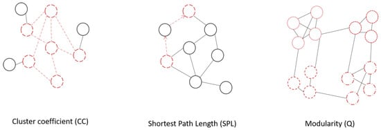 Visualization of the network measures used in the current study. The cluster coefficient measures the extent to which the nodes are interconnected. The shortest path length is the minimum number of edges between two nodes. The average shortest path length (ASPL) was calculated and used as a measure. Modularity measures the tendency to form subgroups within the network.