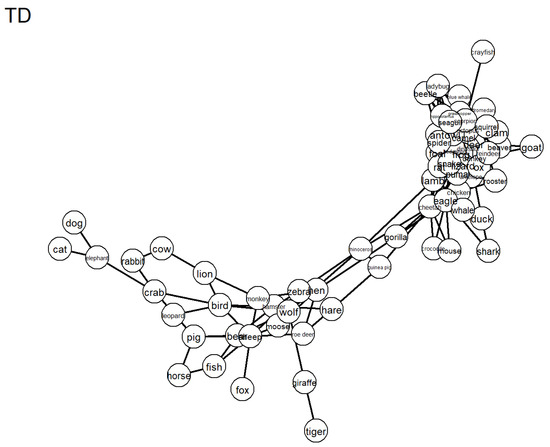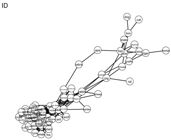 As can be seen in Figure 2 and Figure 3, the network of the adolescents with ID includes more close nodes and exhibits a shorter ASPL. In addition, the network is less spread out. Neither the network of the children with TD nor the network of the adolescents with ID appear to have clear subgroups. Rather, many words are not clearly separated. For the network of the children with TD, there is a tendency towards the development of subgroups, which is not the case as much for the network of the adolescents with ID. This is also mirrored in the Q, which is significantly larger for the TD group compared with the ID group. Further, the adolescents with ID exhibit a higher CC compared with the children with TD. This is visible in the figures, as the largest subgroup of the ID group is more densely clustered (see bottom left in Figure 2) compared with the largest subgroup of the TD group (see top right in Figure 3). For the TD group, the developing subgroups are mostly related to the expected taxonomic structure of the animal category, while this is true to a lesser extent for the ID group. Note that the network layout was created using the Fruchterman–Reingold algorithm [37], which is very sensitive to small differences in network properties such as path length. The position of the large subgroups on the opposite ends for the ID group compared with the TD group is therefore merely an artifact of how the network plot was created.