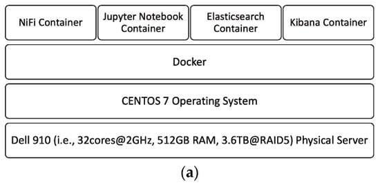 As shown in Figure 1a, the user interface is a HyperText Markup Language version 5 (HTML5) presentation of NiFi, Kibana, and Jupyter Notebooks via an SSH tunnel to the Docker container exported ports. The hardware interface includes a Dell 910. The software interface includes CentOS and Docker. Docker orchestrated the creation of four required servers to conduct the experiment: Elasticsearch, Kibana, Apache NiFi, and Jupyter Notebook. Configuration changes to NiFi were required due to the vast size of the JSON files. Since the default memory setting of 512 MiB for Java Virtual Machine (JVM) is not capable of deserializing JSON OpenSky ADS-B messages, memory was increased to 30 GiB. These configuration changes allowed the NiFi processors to process JSON files. Figure 1b presents the specifications of the architecture.