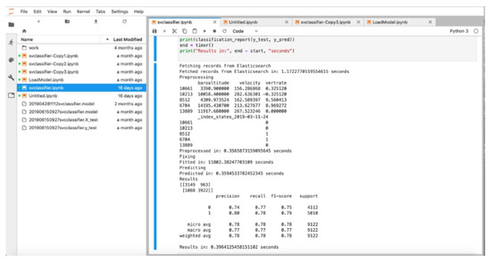 Jupyter Notebook fetched 10,000 real ADS-B messages from Elasticsearch REST API and 10,000 generated attack ADS-B messages (Figure 3). The results were combined into one pandas data frame for training and testing (Figure 4). Preprocessing dropped all rows with the same icao24. The drop method removed all fields except velocity, baroaltitude, vertrate, and index. The ▁index field determines if the row is an OpenSky collected ADS-B message or a NiFi Custom Processor generated attack. The replace method filled empty fields with the null value of np.nan. The dropna method dropped all fields with np.nan. One-hot encoding replaced the labels within the index numerical representation. Velocity, baroaltitude, and vertrate were numerical values and hence were not one-hotencoded.