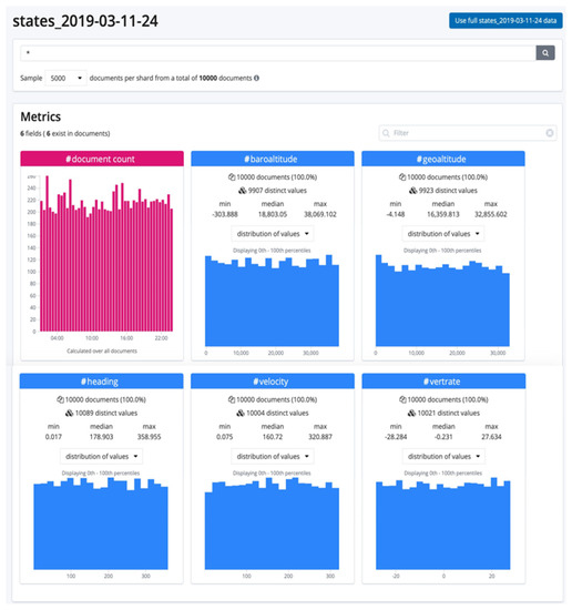 One of the biggest gaps in this kind of research is the availability of labelled data. Data were downloaded from OpenSky ADS-B archives for 24 h on 11 March 2019. NiFi flow created and fetched each hour-long archive with a GetFile NiFi Processor, followed by an unpackcontent NiFi processor to untar the archive (Figure 2). The archives consisted of several files, for which routeonattribute NiFi processor was used to forward only GZip compressed files that contained the actual ADS-B messages. The splitJSON NiFi processor takes the JSON list of ADS-B JSON objects and flattens them into individual JSON objects in its NiFi flow file. The replacedtext NiFi processor properly formats OpenSky JSON to a JSON format accepted by JSON Search. PutElasticsearchHttp NiFi processor then inserts the NiFi flow files into Elasticsearch using the Elastic Search REST API. After data ingest into Elasticsearch, Kabana visualizes the data using line charts, displaying the minimums, maximums, and peaks (Figure 3). Recording the minimum and maximum values of each field, the ADS-B attack generator is more effective.