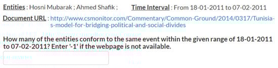 Ground Truth. We dissect the task of evaluating whether or not a web-page contains a fact into atomic microtasks, which are then deployed on a premier crowdsourcing platform, CrowdFlower (http://www.crowdflower.com/(accessed on 21 March 2011)). For each of the 7257 pairs in our dataset, workers had been supplied with a description of the event key phrases and timespan, as well as the report URL. The occasion timespan, which is specified by a start and an end day, was strictly taken into consideration throughout the tasks. The workers were then asked simple questions regarding the occurrence of keywords and their alignment to the stipulated timespan. The task was to report the number of fact keywords conforming to the same fact in the page and within the fact chronological interval (see Figure 3). We observed project design recommendations and hired gold standard questions to discover untrustworthy workers.