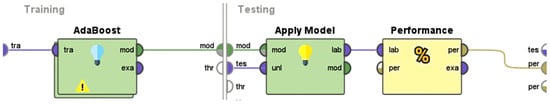 AdaBoost, an abbreviation for Adaptive Boosting [93,94], is a machine learning-based algorithm, which can “boost” or improve the performance accuracy of machine learning-based classification models when used with them in combination. The algorithm uses specific characteristic features from the training data that would help to “boost” the accuracy of the final prediction in the test data. This concept helps to reduce dimensionality and improves the operation time, as those characteristic features of the data that do not significantly contribute towards the classification task are not calculated anymore. The algorithm helps to reduce the overfitting of data as well. After AdaBoost is applied to any machine learning-based classifier, the boosted version of the same can be represented as per Equations (9) and (10).