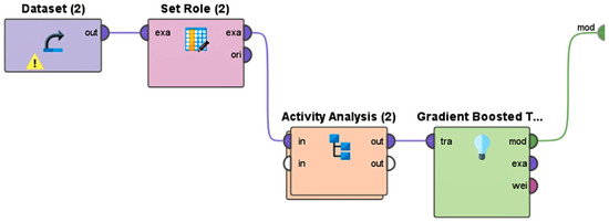 Gradient Boosted Trees is a machine learning approach that is used for a range of classification and regression-related tasks where a high-performance accuracy is necessary. The output of this method is an ensemble of decision tree-based predictive models, and it usually outperforms the random forest-based learning approach [90,91]. The methodology builds the learning model in a stage-wise and iterative manner similar to other boosting methods in machine learning, and it generalizes them by allowing optimization of an arbitrary differentiable loss function [92]. The methodology by which the Gradient Boosted Trees approach works is represented by Equations (4)–(8).