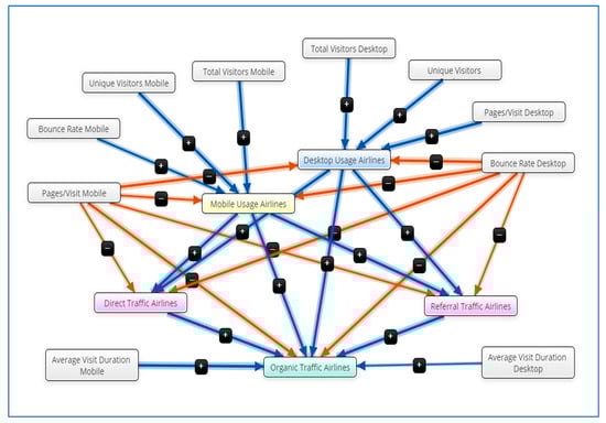 Therefore, we deployed a Fuzzy Cognitive Mapping (FCM), which will implement selected web metrics of both airline devices depicting the relationships, so as to get a more adaptive model for process assessment. Fuzzy cognitive mapping deploys a descriptive and consolidated stochastic classification methodology, mainly used to represent the correlations between airlines’ web metrics. Blue and red arrows in Figure 2 illustrate variables with positive and negative relations accordingly. Development of the FCM has been conducted via the Mental Modeler cloud-based application.
