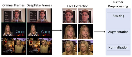 As it is pointed out in Section 1, DeepFake generation algorithms mainly manipulate face regions and leave the background part intact. Therefore, focusing on the face region of a video frame, instead of analyzing the whole frame as input to the learning model, not only improves the detection performance by reducing background noise but also reduces the computational time by reducing the size of the input sample [58]. To this end, the following steps, as shown in Figure 3, are taken for face localization and further analysis. First, for each input video, of the frames are extracted in consecutive order, yielding to over 2 million frames on Celeb-DF (V2) dataset. Second, the state-of-the-art face detection method, i.e., RetinaFace [59], is utilized to locate facial landmarks on each extracted frame. The obtained facial landmarks are utilized to crop, align, and resize the faces to standard configuration [60]. These cropped frames, containing only face regions, are further used for attention-based image augmentation and feature extraction.