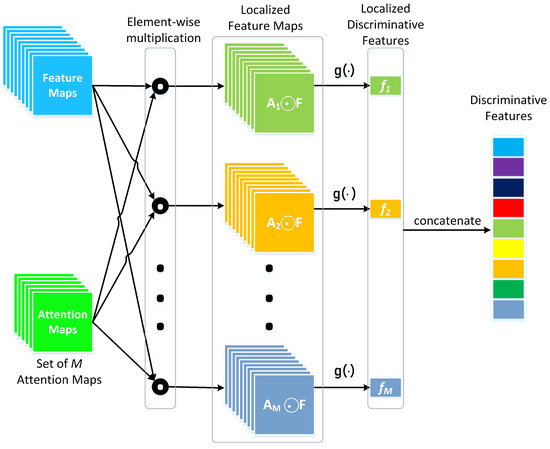 Localized discriminative feature extraction framework. Element-wise multiplication of feature maps with specific attention map results in localized feature maps to pool more discriminative features.