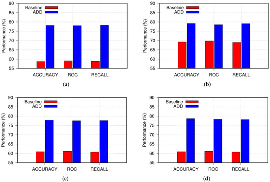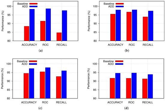 The DeepFake detection method results on Celeb-DF (V2) using four different baseline models and ADD configurations. As shown, all four configurations of ADD can significantly improve all three evaluation metrics, i.e., accuracy rate, ROC, and recall. Note that all models are trained and evaluated against the same datasets. (a) Backbone: ResNet Model; (b) Backbone: Xception Model; (c) Backbone: VGG Model; (d) Backbone: MobileNet Model.