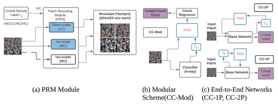 In [56], Sajid et al. proposed a plug-and-play-based patch rescaling module (PRM) to address the problem of crowd diversity in the scene. As shown in Figure 7, the PRM module takes a patch image as input and then rescales it using the appropriate scaler (Up-scaler or Down-scaler) according to its crowd density level, which is computed by the classifier before using PRM. In this approach, the low-crowd and high-crowd regions pass directly through the Up-scaler or Down-scaler, the Medium-crowd bypasses the PRM without rescaling, whereas the no-crowd regions are automatically discarded.