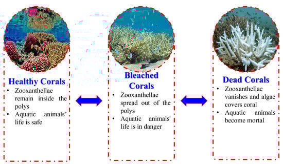 Coral reefs are one of the most important ecosystems on the planet because they help to maintain biodiversity and the life cycles of so many marine species. Many large-scale mass mortality incidents linked to coral bleaching have unfortunately been reported. Coral reefs have diverse intra-class variations in their color, shape, size, and texture. The color of the corals vary significantly due to light attenuation and light scattering phenomena. The coral reef has a vital role in preserving biodiversity, ceasing coastal erosion, and promoting the business trade. However, they are declining because of over-exploitation, damaging fishery, marine pollution, global climate change, and many more. Corals seem pale when they get bleached due to climate change. Coral bleaching is the leading cause of the decline in corals. Human activities on the earth have caused a tremendous increase in carbon dioxide concentration and ultimately lead to marine ecosystem devastation that mainly includes coral reefs [1,2,3,4]. Figure 1, shows the three different types of corals which are healthy, bleached, and dead corals. Similarly, this Figure also demonstrates the impact of corals bleaching on aquatic animals life.