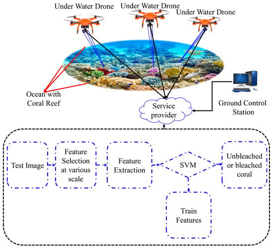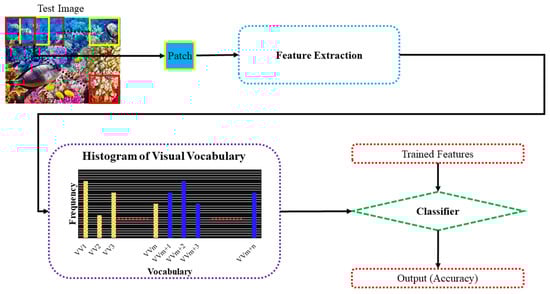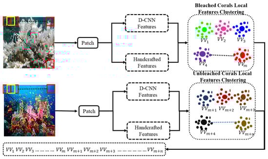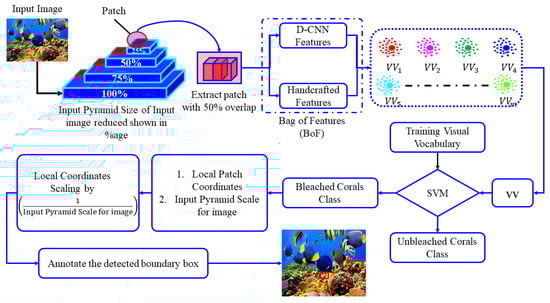 Initially, an image is taken with the help of an underwater drone. In the next step, the image is segmentized and divided into small patches. Features are extracted from each patch with the help of handcrafted descriptors and D-CNNs. A visual vocabulary (VV) is created, as shown in Figure 4, this visual vocabulary is the features extracted from these features, and the training features are passed to classifier i.e., SVM, which classifies whether the VV-features are of bleached coral or healthy coral. We used different handcrafted features as well as different D-CNN’s but AlexNet shows the highest accuracy. We used different classifiers i.e., SVM, kNN, and decision tree, but SVM outperforms all other classifiers.