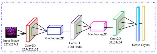 We create a custom D-CNN named as CoralNet for the extraction of the spatial features. CoralNet has thirteen layers in which three layers are convolutional layers (Conv2D), two max-pooling (MaxPooling2D) layers, two dense layers, one flatten layer, three activation layers. The input layer size is kept at 227 × 227 × 3. Two activation layers have rectified linear unit (ReLU) as activation function while the last activation layer uses softmax as activation function. Features are extracted with Conv2D layers and the feature vector is extracted at the last layer. The training options used for training CoralNet are summarized in Table 1. The simplified architecture of the CoralNet is shown in Figure 6.