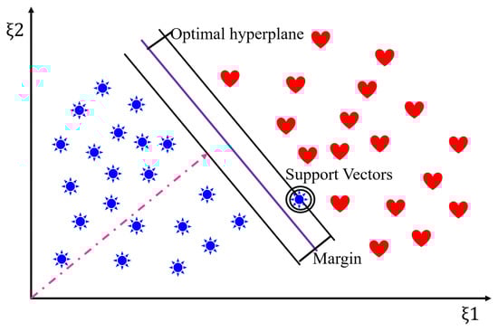 The classifier used is SVM [30,31,32,33]. It makes classification of the objects and samples by creating a hyperplane between the objects as depicted in Figure 7. To achieve higher accuracy the margin is kept high. A high margin gives better accuracy. There are three kernels of SVM. For binary classification linear kernel of SVM proves efficient while for multi-class classification Gaussian and polynomial kernel prove effective. The equations of these kernels are Equations (1)–(3), respectively.