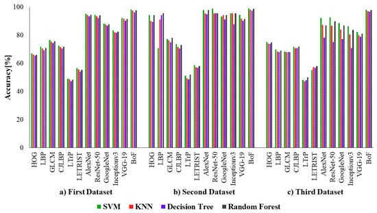 Handcrafted descriptors and D-CNN models are utilized for features extraction, while SVM is used as a corresponding classifier. Table 2, Table 3 and Table 4 show the classification of the highest accuracy, specificity, sensitivity, F1-score, and Cohen’s kappa of SVM kernels of each handcrafted descriptor and deep convolutional neural network (D-CNN) for first, second and third dataset, respectively. Whereas Figure 10 shows the performance of the different classifiers when applied on all three datasets. The performance of SVM is compared with kNN, decision tree, and random forest. It is clear that SVM performs better than kNN, decision tree, and random forest. Figure 11, shows the confusion matrices of the proposed method for first and third dataset. The performance of the model is also efficient for the multi-class classification problem. Moreover, the dataset gives identical results when applied to the other binary classification dataset as well. The model is trained one dataset and gives better performance on other dataset as well.
