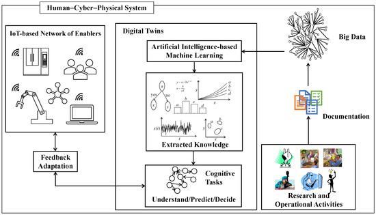 Smart manufacturing (or Industry 4.0) [1] embarks on a human-cyber-physical system (HCPS) [2], as shown in Figure 1. The HCPS (Figure 1) [2] consists of Internet of Things (IoT)-based manufacturing enablers [3], digital twins (DT) [4,5], big data (BD) [6], and documentation of past research and operational activities.