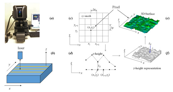 Nowadays, surface roughness [13,14] is measured by laser-based non-contact surface metrology instruments [28], as shown in Figure 2a. This type of instrument moves a laser source on the surface to be measured in a definite trajectory, as shown in Figure 2b. For this, the instrument first sets an xy-mesh (Figure 2c) and obtains the height information of the surface (Figure 2d). In addition to height information, the instruments can represent a mesh using a pixel [29]. As such, two types of information are produced. One of the types consists of a 3D surface based on height information (Figure 2e,f).