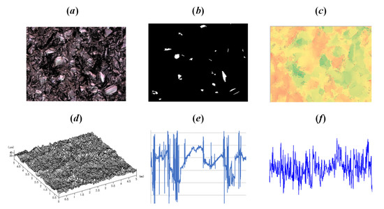 Different types of datasets of surface roughness. (a) Surface image; (b) Binary image obtained from (a); (c) Hight gradation image; (d) 3D rendering of heights; (e) Surface profile; (f) Surface roughness profile.