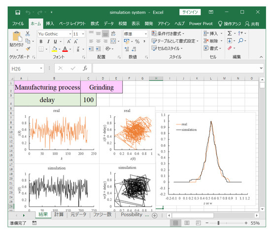 The segment coupled with the simulation algorithm segment is the simulation system because the system is developed using the simulation algorithm. The simulation system must be kept simple to mitigate the BD inequality (see Section 4). At the same time, it must be executable by many stakeholders, including those who belong to medium and small organizations. Based on this consideration, the authors used a spreadsheet-based computer program to build the simulation system; one of the user interfaces is shown in Figure 8. As seen in Figure 8, the user can set a delay and input the data points of surface roughness heights. The system simulates the surface roughness heights. The similarity between the simulated and real surface roughness heights can be compared in terms of time series, delay maps, and possibility distributions, as shown in Figure 8.