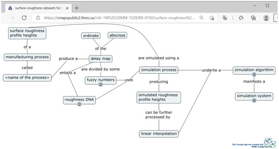 The resulting concept map is shown in Figure 9. This map is the semantic annotation segment of the surface roughness dataset to be added to BD. The URL of this annotation is https://cmapspublic2.ihmc.us/rid=1WYZG3ZMM-1SZ8JR8-41S0/surface-roughness%20datasets%20for%20big-data.cmap (accessed on 20 October 2021). It can be accessed through the Internet. The annotation also carries the roughness DNA, fuzzy numbers of the return map, simulation algorithm, and the simulation system, which can be downloaded for reuse (for building DT of surface roughness). Alternatively, XML code of the annotation can be generated to use the code in an IoT-based enabler network directly.
