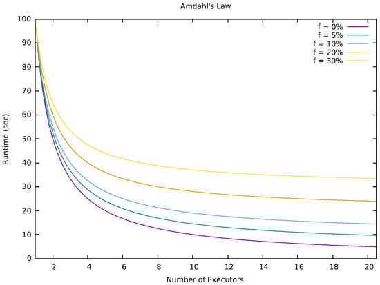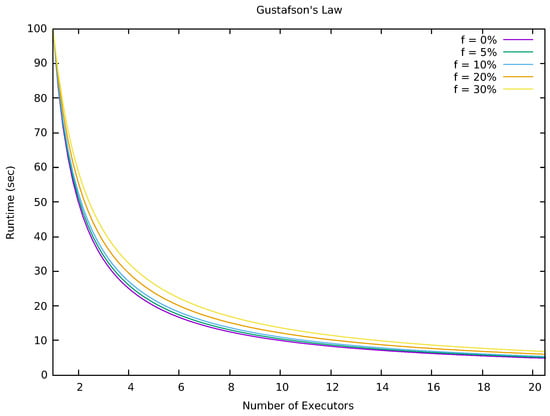 An example of what Gustafson’s Equation (5) means for different serial factors and numbers of executors is shown in Figure 3. It shows the influences of both parameters on the runtime of a simulated job with a fixed dataset size.