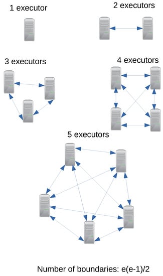 For simplicity, we assume that each node will communicate with every other node, and that the communication (be it HDFS or partial computations being exchanged between nodes) is symmetric and homogeneous. This makes the growth of a function of both the size and number of executors. We hypothesise that a good approximation for depends on the number of links between the nodes. This is the same as the number of edges in a fully connected graph: