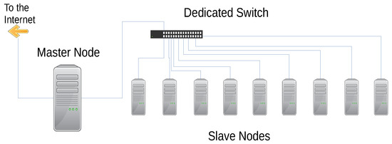 The experimental big data cluster used in this work was designed and developed by a group of academics at Massey University, Auckland campus [38]. The hardware for this experimental big data cluster is similar to a Beowful cluster. The cluster runs on dedicated network infrastructure with dedicated switches. All other network machines are kept away from this infrastructure to reduce the network latency and unwanted network resource utilisation. The cluster was designed and developed with one master node and nine slave/worker nodes. The Hadoop cluster server and node configuration is presented in Table 2. The schematic diagram of the cluster is presented in Figure 6.