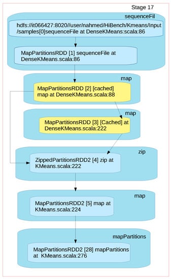 Kmeans: K-means is a well-known clustering algorithm that is commonly used for knowledge discovery and data mining. The Kmeans input data are a group of samples, generated by GenKMeansDataset, which is based on uniform and Gaussian distribution. We used various amounts of input data, such as tiny, small, and large, with the dimensions of 3 and 20; “no of cluster”, 5; “max-iteration”, 5; centroid, 10; and converged, 0.5. The job was executed in 19 different stages, and a sample of job DAG stages is shown in Figure 8.