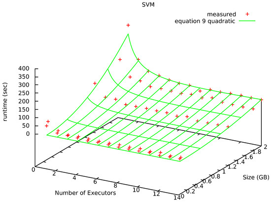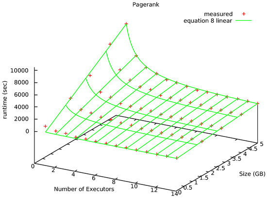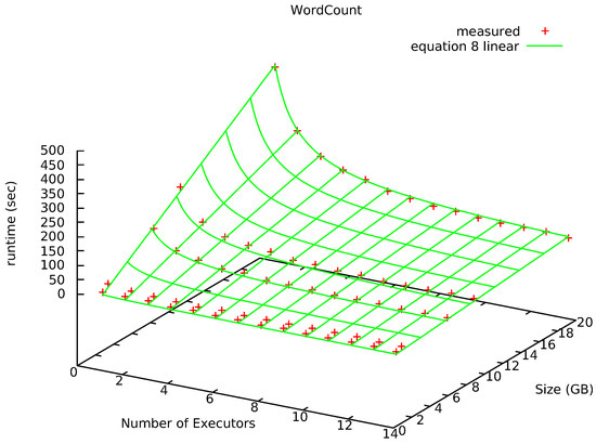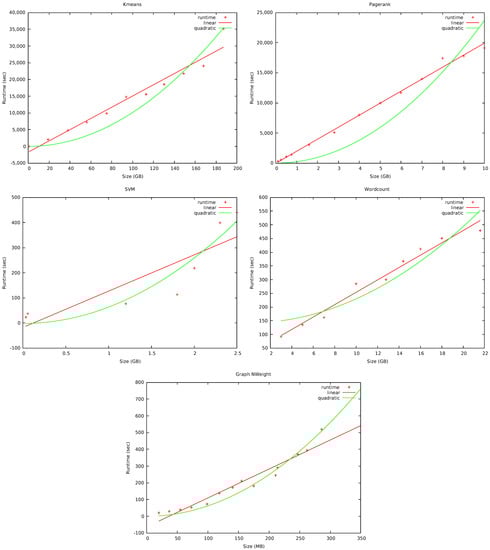 where a is a constant coefficient, and is a function that reflects the growth of the runtime with increasing sizes (an approximation of the algorithm complexity). As most of the workloads implemented in HiBench are either linear or quadratic, can be replaced by either or .