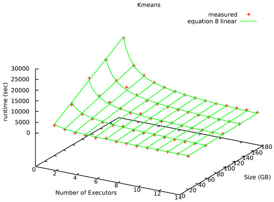 Our work considered three well-established equations, namely, those of Amdhal [36], Gustafson [37], and Ernest [31], as comparative models. We limited our analysis to these models while recognising the existence of alternative models in the published literature, which we deemed out of scope for the purposes of this study. As shown in Table 7 and Table 8, for every workload, both proposed models (Equations (8) or (9), and (15) or (16)) had better fitting results than Ernest. Only in two cases did Amdahl’s model Rsquared tie with our models, Wordcount and PageRank. Only in the case of Kmeans workload did Gustafson’s model tie with one of the proposed models (Equation (8)). The results show that the two proposed models either tied with or performed better than the previously published models.