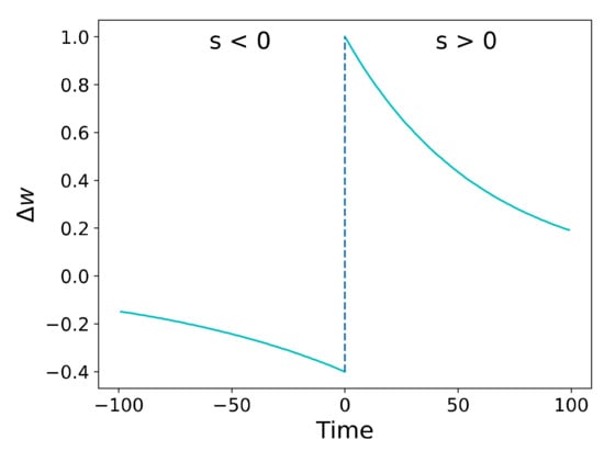 Spike-timing-dependent plasticity (STDP) [17,18] is, probably, the most fundamental form of the unsupervised learning rule observed in biology. It is closely related to Hebb’s postulate: “Neurons that fire together, wire together” [19]. The hypothesis underlying the STDP rule is that the change in the weight of a synapse between two neurons is proportional to the separation between pre- and postsynaptic spike times. If the postsynaptic spike occurs after a presynaptic spike, then the change in the weight of the synapse is positive (i.e., weight is increased), thereby strengthening the causal relationship between the pre- and postsynaptic spikes. On the other hand, if the presynaptic spike occurs after a postsynaptic spike, then the change in the weight of the synapse is negative (i.e., weight is reduced), thereby further weakening the causal relationship between the pre- and postsynaptic spikes. Furthermore, in both cases, the change in the weight is negatively correlated with the difference between the pre- and postsynaptic spike times, i.e., the change in weight is smaller for higher values of the difference between the spike times of the pre- and postsynaptic neurons. The change in weight of a synapse based on STDP is given by