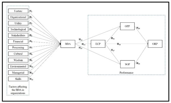 In an attempt to create a conceptual research model (Figure 1), the related literature, particularly research conducted by [1,11,14,28,29,35,36,37], were studied. Finally, according to our previous work [6], it was found that 51 factors in 12 groups affect the BDA in organizations. Table 2 provides definitions of the constructs used in the model. Therefore, in the proposed model, first, the impact of this group of factors on BDA is tested. Then, the BDA effect on organizational performance is investigated. In this model, BD components are independent variables, and organizational performance variables, including economic performance (ECP), operational performance (OPP), social performance (SOP), and organizational performance (ORP), are dependent variables. However, the organizational performance variable is defined as the final dependent variable in the model.