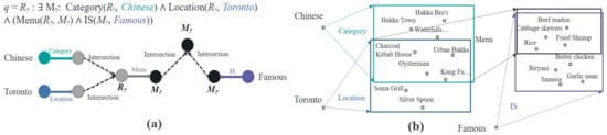 | Logical Query | q = R?:∃R: Category(R?, Chinese) ∧ Location(R?, Toronto) ∧ (((Menu(R?, Noodles) ∧ MenuAttrFor(Sweet, R?)) ∨ (Menu(R?, Butter Chicken) ∧ MenuAttrFor(Spicy, R?))) |