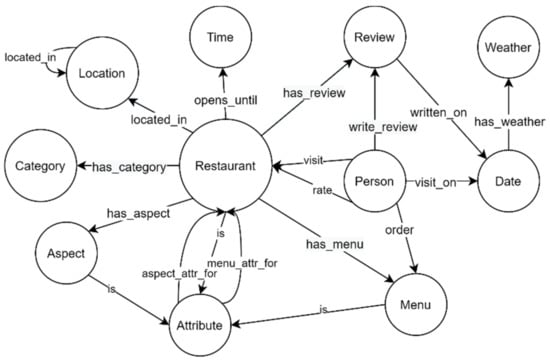 Conceptual graph schema (ontology) for restaurant domain knowledge graph.
