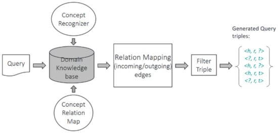 The knowledge graph (KG) is a graph representation of real-world knowledge, whose nodes represent entities and edges that illustrate the semantic relation between them []. A KG is based on the facts that are typically represented as “SPO” triples (subject entity, predicate (relation), and object entity) and are denoted as (h, r, t) or r (h, t). A domain KG defines the entities and relationships of a specific domain. Constructing a domain KG entails creating ontology, designing rules, extracting relations, and storing semantic data. The KG has revolutionized how information is retrieved, in the traditional sense []. Additionally, KGs explain the semantic and attribute relationships between concepts, in order to facilitate reasoning about them. One of the key benefits of a KG is that it can easily integrate the newly discovered facts from the information retrieval process, which captures more detailed facts and attributes on an ongoing basis and significantly resolves the KGs incompleteness problem. Moreover, structured data, in the form of KG triples, reveals numerous interesting patterns that are useful for analytics, deeper queries, and more accurate recommendation. KG is effectively used for a variety of crucial AI tasks, including semantic search [], intelligent question answering [], and recommendation systems [,].