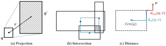 where is an element-wise inequality, is the center of the box, and is the positive offset of the box, representing the size of the box. Then, it describes the box projection and intersection operations, as well as the entity-to-box distance (box distance).