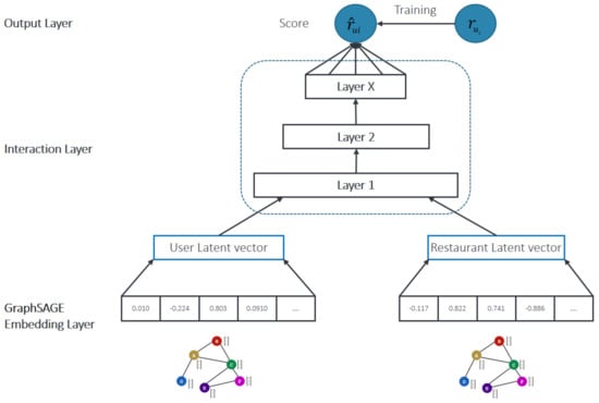 Formally, a KG is defined as follows: is a set of triples, each including a subject , predicate , and object . and are the sets of all entities and relation types of []. KGE models embed entities and relations into a low-dimensional real or complex vector space, while preserving the structure of the KG and its underlying semantic information []. Such KGE models have proven to be extremely useful for a range of prediction and graph analysis tasks []. KGE models are classified into three categories: translational distance-, semantic matching-, and neural network-based models. Translational distance models or additive models TransE [], TransH [], and TransR [], use distance-based scoring functions to calculate the similarity between the different entities and relations, thus build the embedding accordingly []. On the other hand, semantic matching models, or multiplicative models RESCAL [], DistMult [], and ComplEx [], employ a similarity-based scoring function. In translational-based models, given a triple (h, r, t), the relation r translates the head entity h to the tail entity t. These models define a scoring function to measure the correctness of the triple in the embedding space. However, these models are reported to have low expressive power and do not capture semantic information []. The multiplicative models outperform the additive models by capturing more semantic information []. The third category includes models built on graph neural networks (GNNs), such as ConvE [], ConvKB [], and GraphSAGE []. These models consider the type of entity or relation, temporal information, path information, and substructure information []. Among these models, GraphSAGE is a framework for learning inductive representations on large graphs []. Furthermore, it achieves low-dimensional vector representations of nodes, while utilizing their attribute information, which makes GraphSAGE more appropriate for generating contextual embedding for recommendation and prediction tasks than any other KGE models. Thus, we adopt this model for obtaining user and item latent vector for training and inferencing our NCF model.